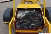 Winda Budowlana – wyciąg HERZOG JUNIOR 200 AV. na przyczepie masa własna 620 kg udźwig 200kg wysokość 9m (3 elementy wieżowe) – możliwość szybkiego demontażu do transportu Winda posiada instrukcję obsługi. Opis techniczny: – zasilanie elektryczne 230V, – krańcówki regulujące max. podnoszenie i opuszczanie, – maszt ze stali ocynkowanej, – prędkość podnoszenia 22 m/min, – platforma robocza o wym 110 x 160 cm , – platforma składana, – platforma obrotowa (trzy kierunki), – platforma z zabezpieczeniem bocznym, – rolki prowadzące na łożyskach, – podest z blachy antypoślizgowej z podestem do zjazdu np. taczki, – winda mobilna na kołach