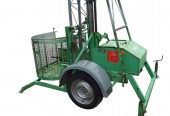 Winda Budowlana – wyciąg HERZOG JUNIOR 200 AW. na przyczepie masa własna 620 kg udźwig 200kg wysokość 9m (3 elementy wieżowe) – możliwość szybkiego demontażu do transportu Winda posiada instrukcję obsługi. Opis techniczny: – zasilanie elektryczne 230V, – krańcówki regulujące max. podnoszenie i opuszczanie, – maszt ze stali ocynkowanej, – prędkość podnoszenia 22 m/min, – platforma robocza o wym 110 x 160 cm , – platforma składana, – platforma obrotowa (trzy kierunki), – platforma z zabezpieczeniem bocznym, – rolki prowadzące na łożyskach, – podest z blachy antypoślizgowej z podestem do zjazdu np. taczki, – winda mobilna na kołach